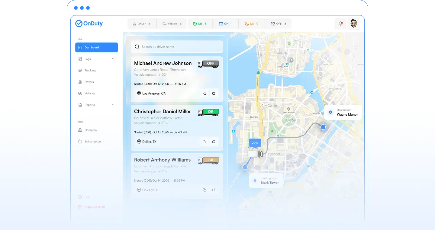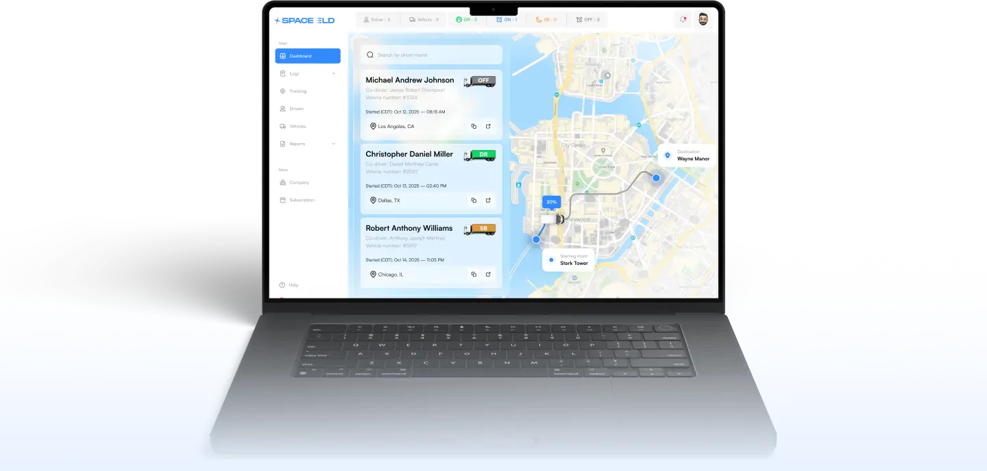 Our dispatcher console gives fleet managers full real-time visibility and control over drivers, logs, statuses, trucks, and notifications — all from a single dashboard